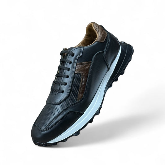 sneaker de piel napa color negro tabaco detalle perfordo punto performante