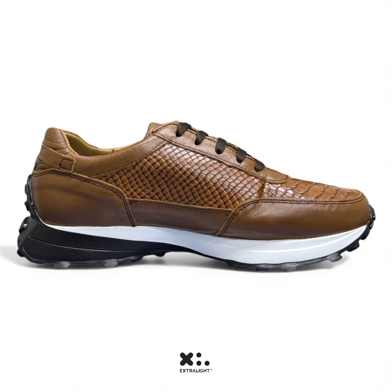 Sneaker de piel con estampado de piel de pitón en la parte trasera. Cuenta con tecnología extraligera 20k15. Diseño vanguardista que combina estilo y confort para un caminar ligero y cómodo.
