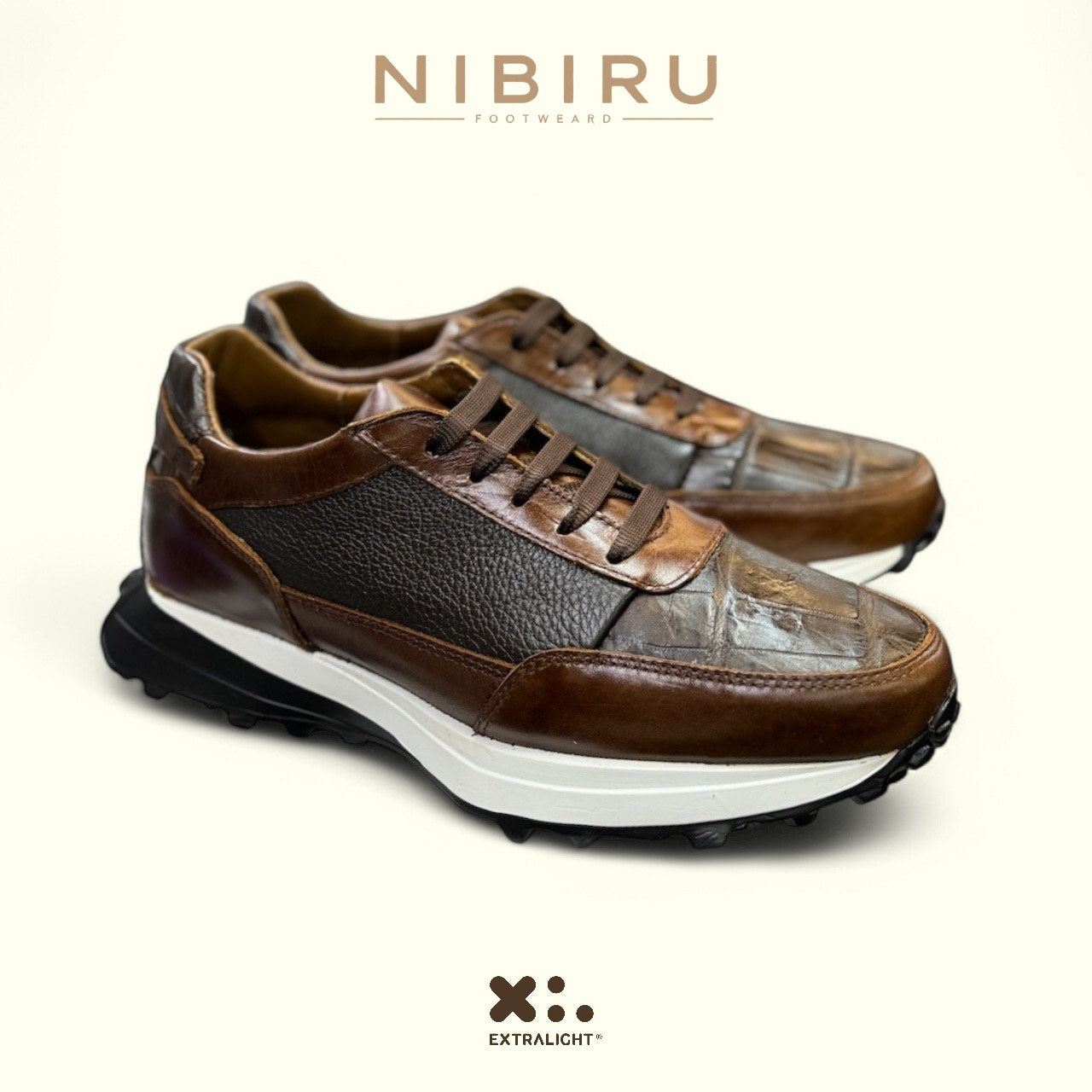 sneakers de piel coñac becerro / piel alligator cafe tabaco suela extralight 20k